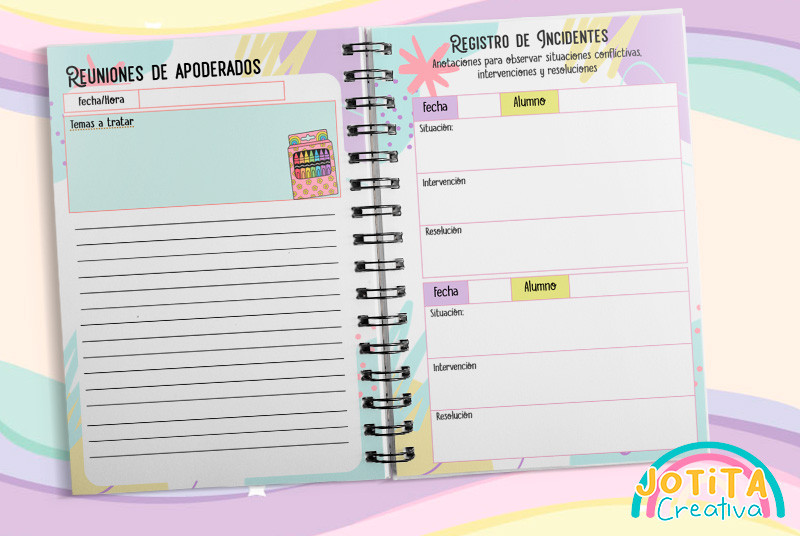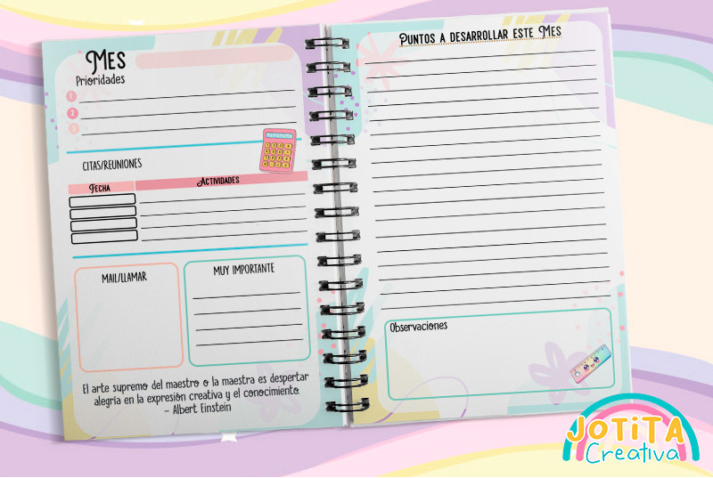 La Agenda Docente Colors es un archivo digital editable en PPT y PDF diseñado para que emprendedores personalicen, impriman y vendan agendas escolares profesionales. Con más de 250 páginas sin fechar, incluye calendarios, registros, planificación mensual y semanal, evaluaciones y más. Un producto completo, rentable y adaptable para tu negocio de papelería.