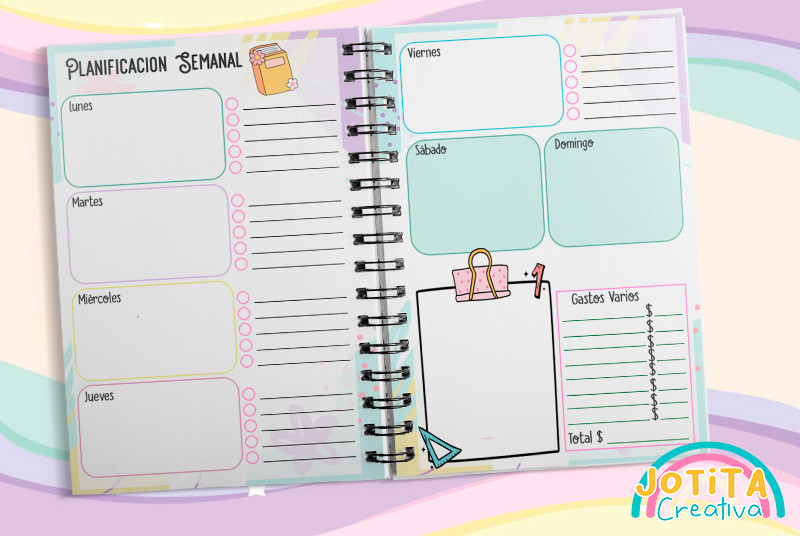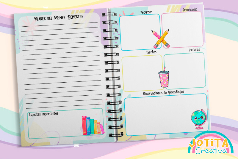 Kit de 10 cuadernos (PDF), diferentes temáticas. Cada uno incluye: hoja de datos personales, calenda..