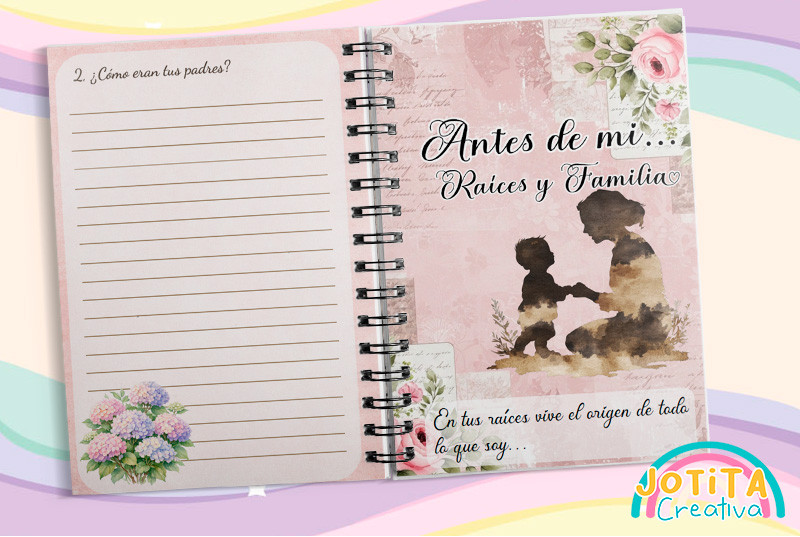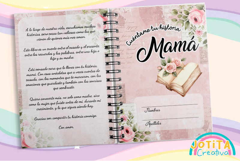 El diseño Cuéntame tu historia Mamá es una herramienta perfecta para emprendedores de papelería que buscan ofrecer productos con valor emocional y significado profundo. Este libro guiado permite a las madres escribir su historia de vida a través de preguntas cuidadosamente diseñadas.