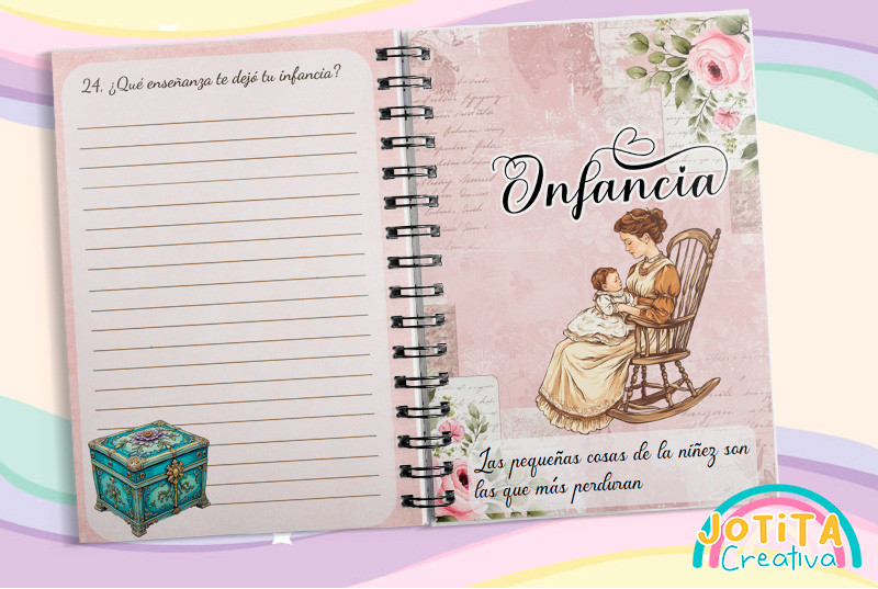 Cada página incluye ilustraciones únicas que enriquecen la experiencia, y cada capítulo incorpora una frase emotiva que conecta con la historia personal.